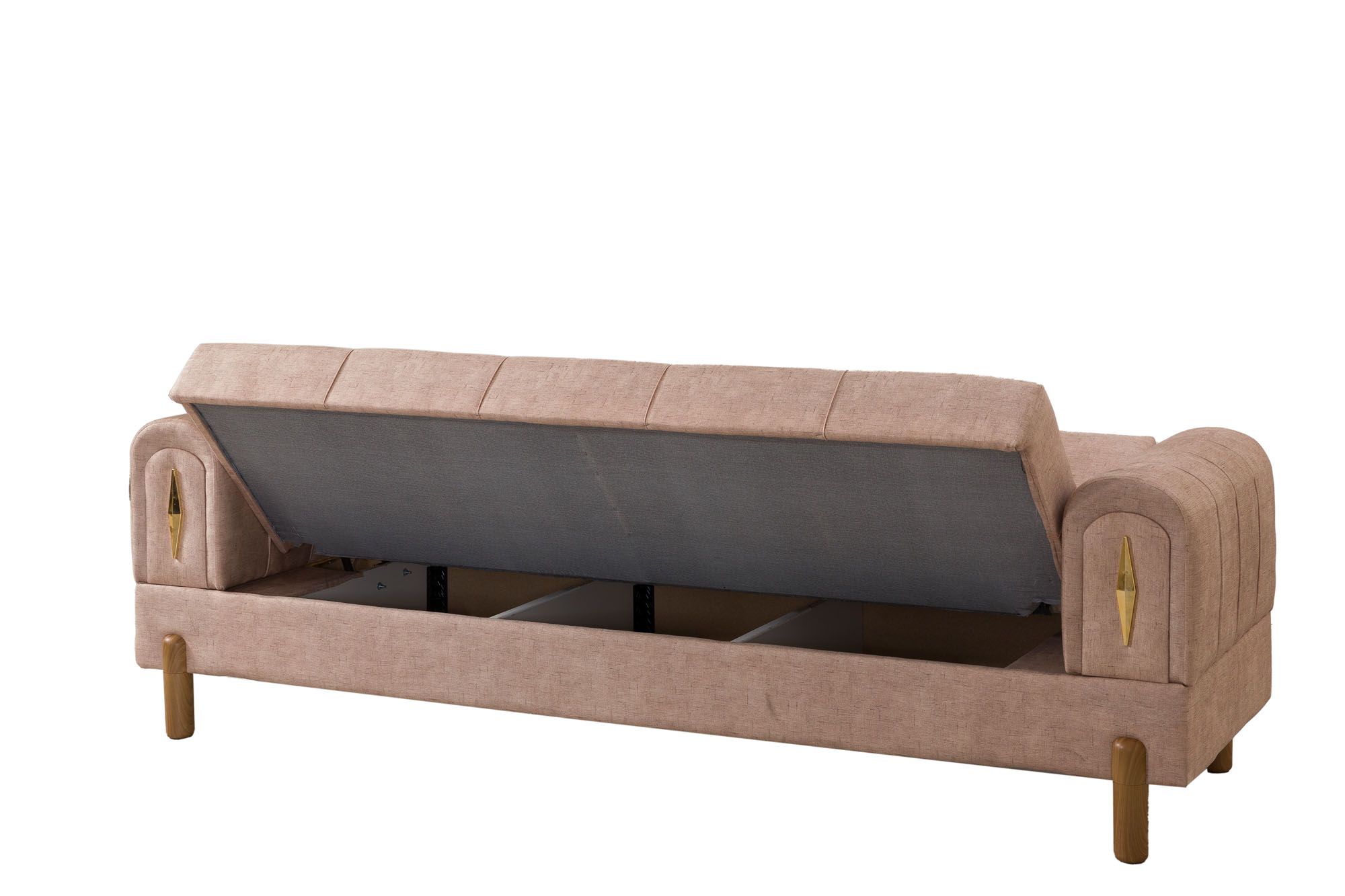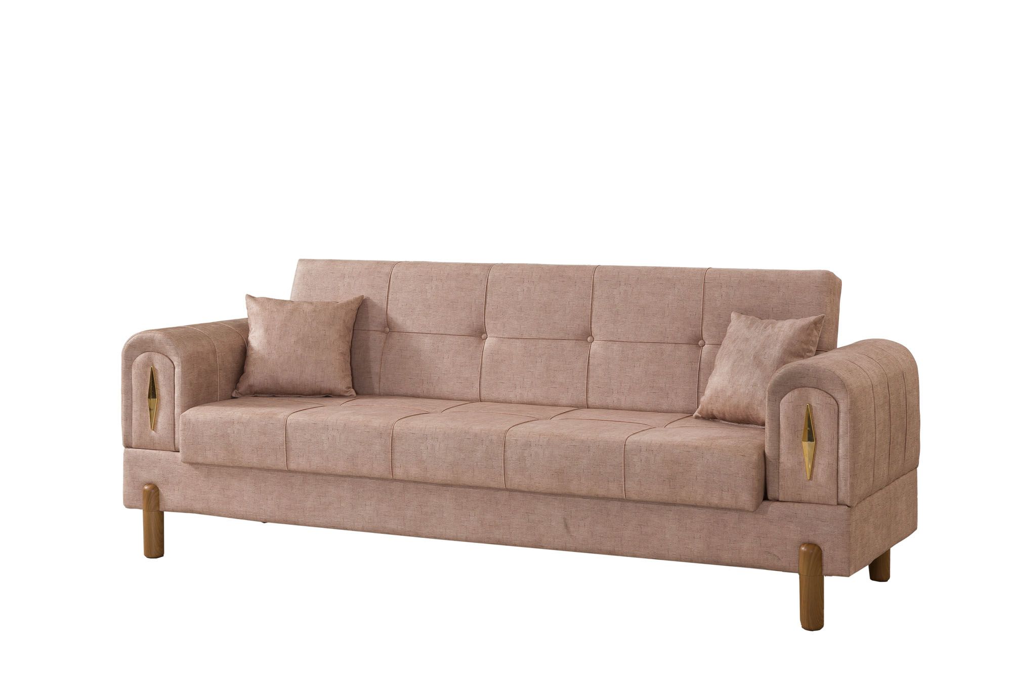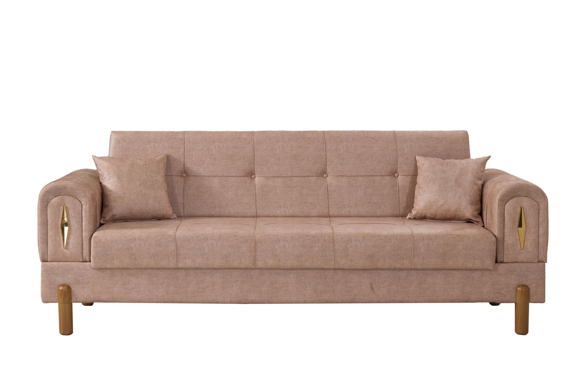 Güneş Kanepe'nin en belirgin ve çekici özelliklerinden biri, kolçaklarının dış kısmında yer alan zarif altın rengi metal detaylardır. Bu parıltılı dokunuşlar, kanepenin genel tasarımına lüks ve çağdaş bir hava katarken, adeta bir mücevher gibi parlayarak göz alıcı bir odak noktası oluşturur.